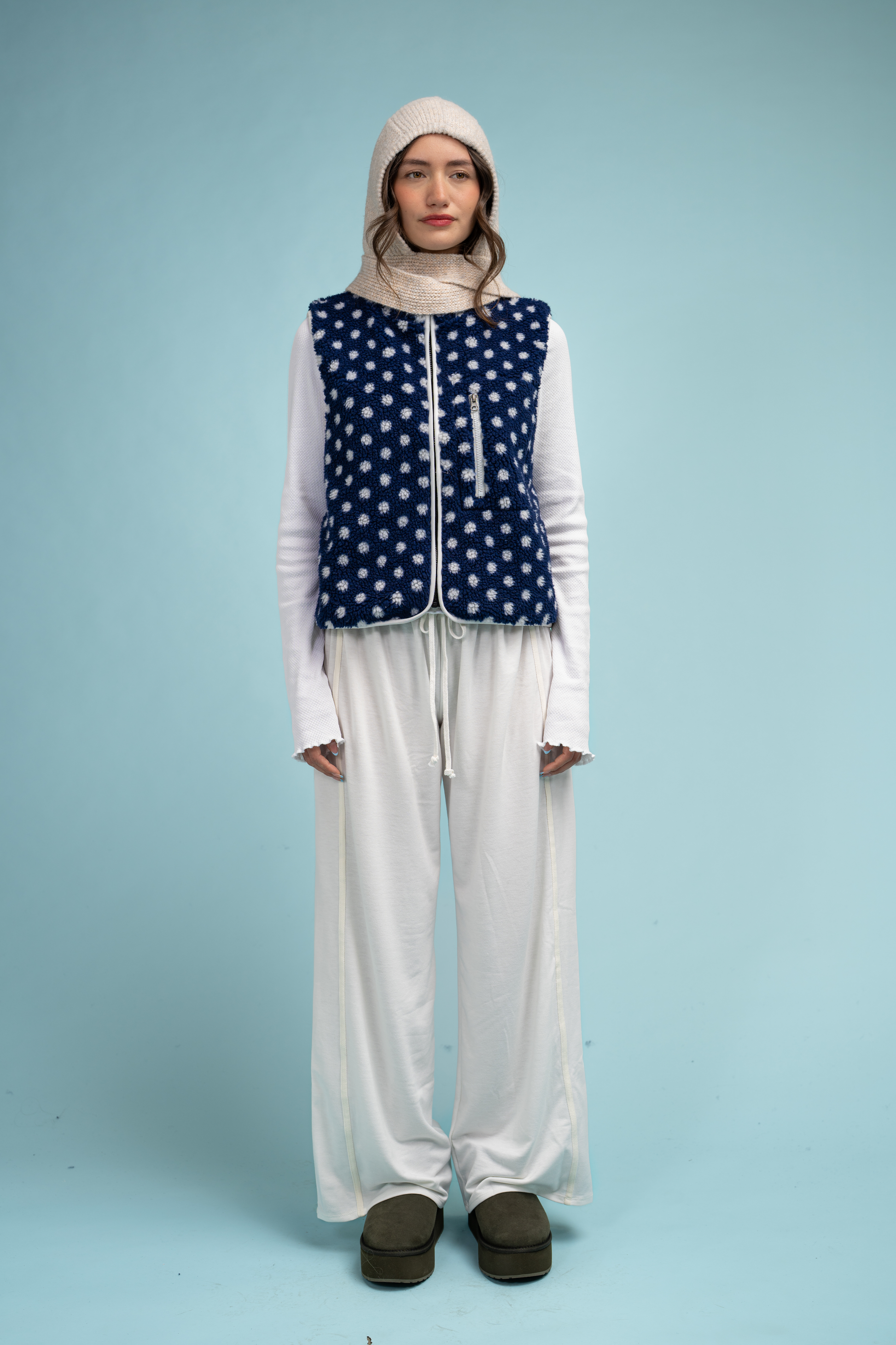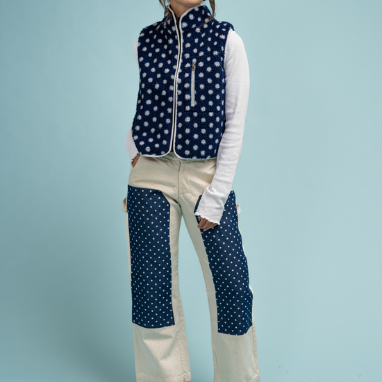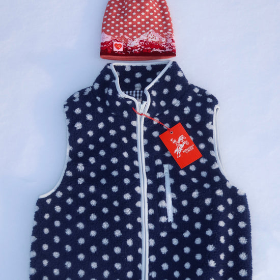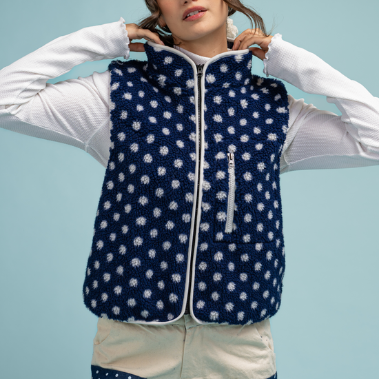 Our most loved style is back in a new color way. The Montana Vest, now in Navy Dot--a rich navy blue polkadot patterned sherpa pile fleece fabric complete with a classic gingham lining. Our Montana vest features a mock neck, a boxy, lightly cropped fit with a front chest pocket to fit all of your on-the-go essentials like cellphone, lip gloss and wallet.