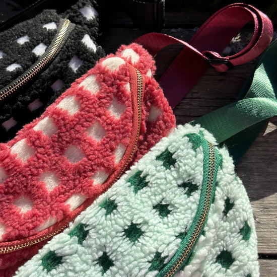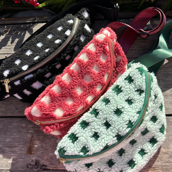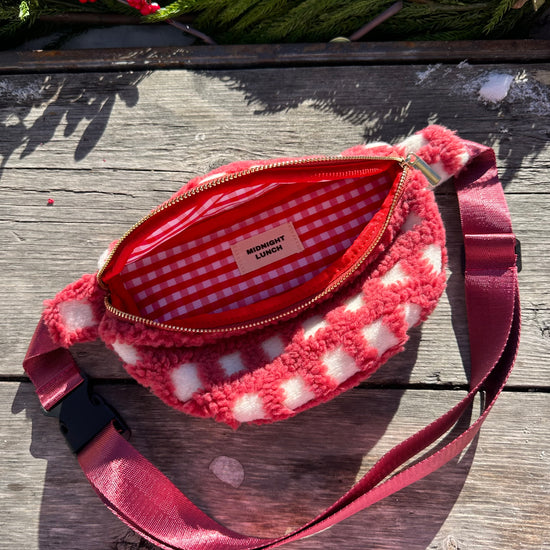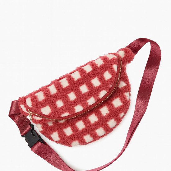 Adjustable belt bag in our signature red sherpa gingham fabric.