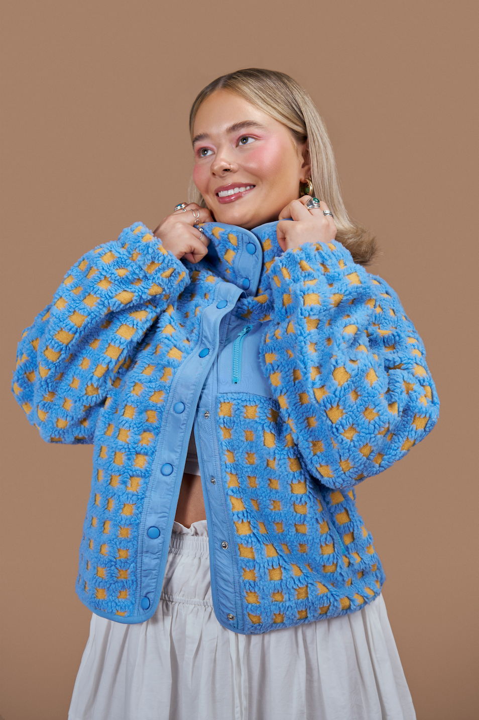 Introducing the Teton Jacket. A classic silhouette with a bold and playful spin. Features a double-lined fleece mock neckline, full button up closure and three zip pockets. Full Length with a slight balloon sleeve. The body of the jacket is unlined with a structured woven interior making it perfect for layering.