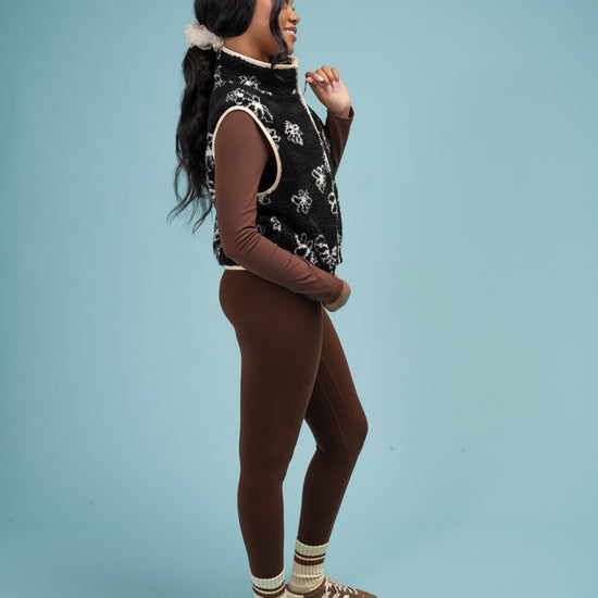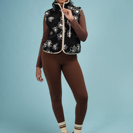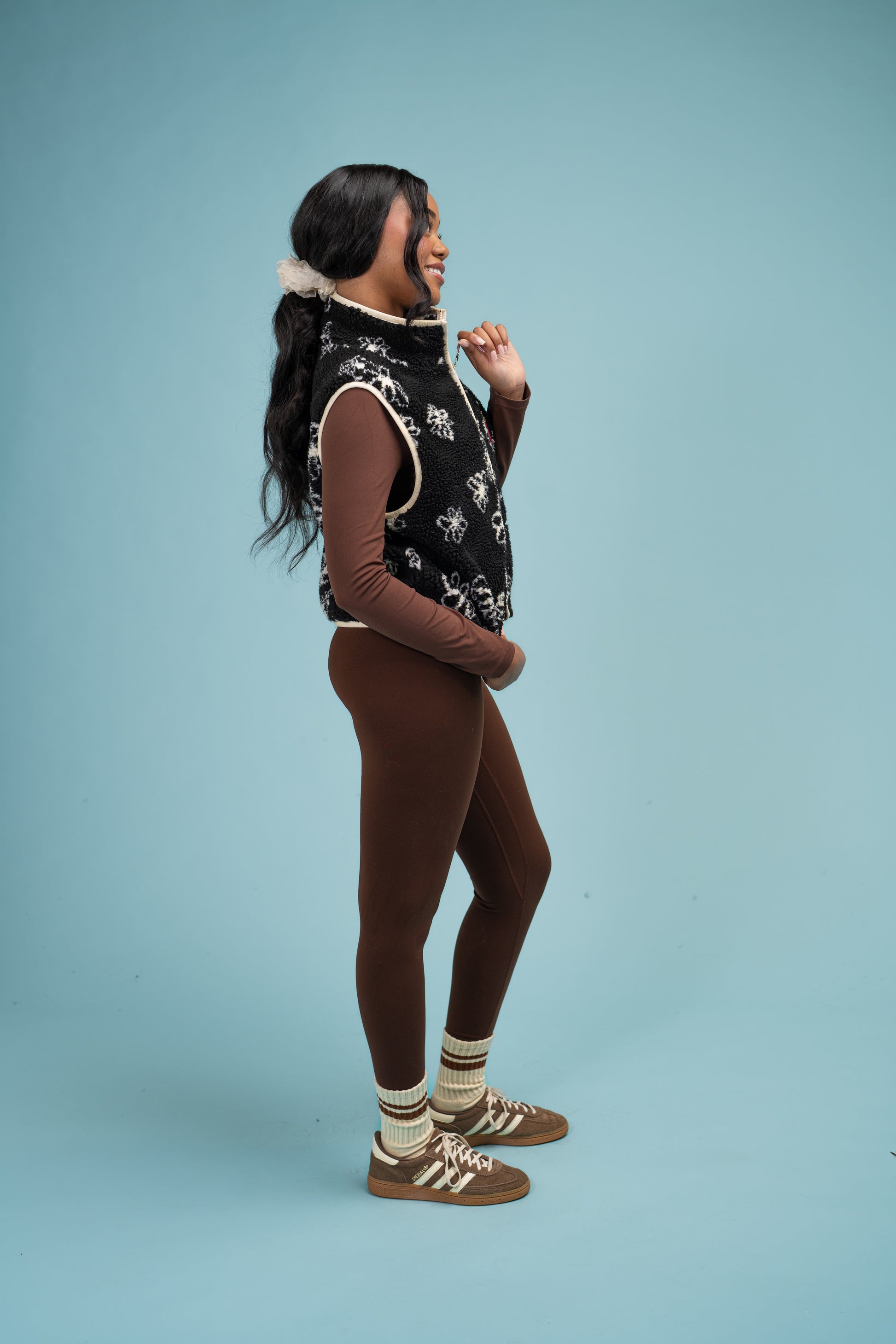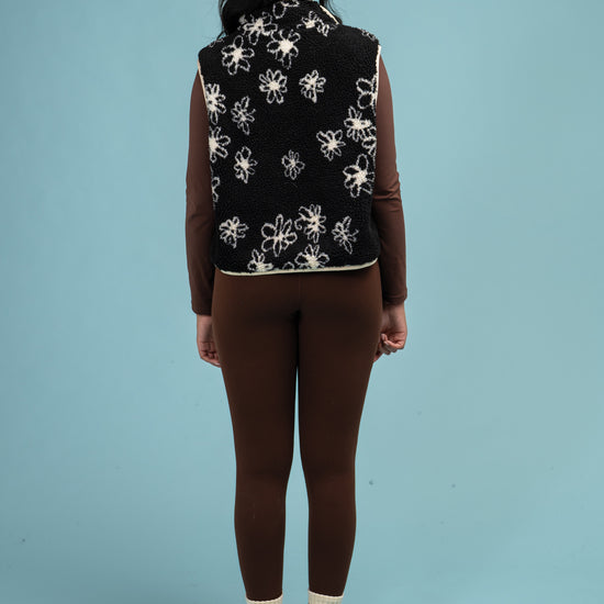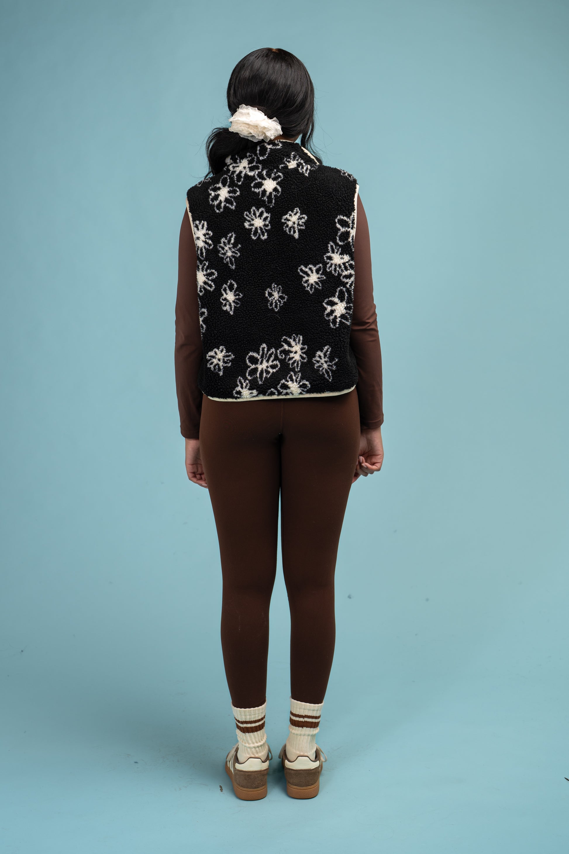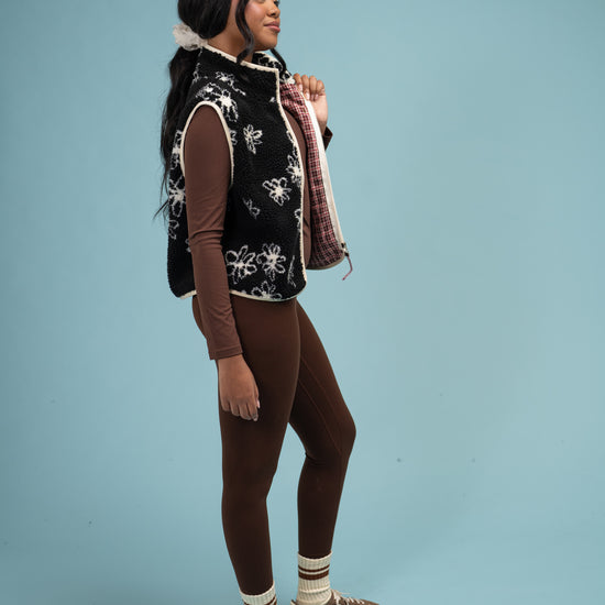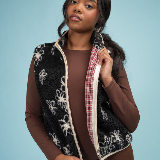 Our most-loved vest style now in all allover floral sherpa pattern featuring a vintage inspired plaid lining and chest pocket to fit your phone and other essentials. Slightly cropped, boxy fit. Perfect for layering.