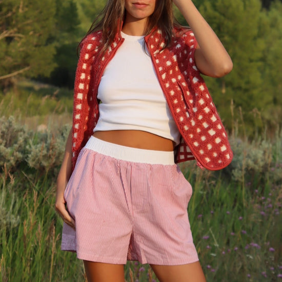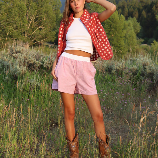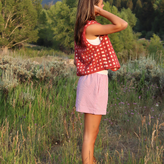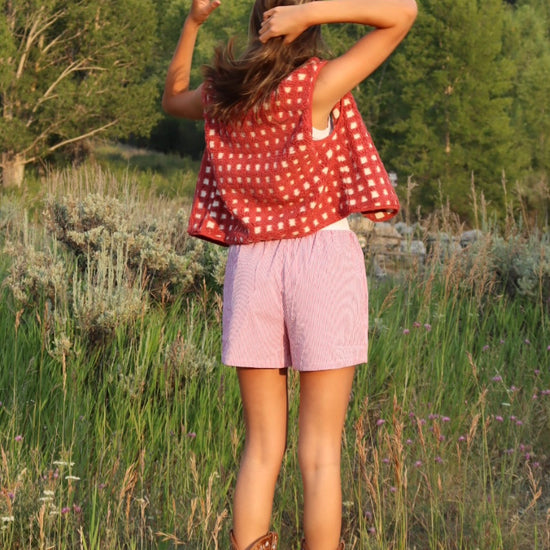 These vests have a cropped length and slightly boxy fit. We recommend sizing up if you are in between sizes.